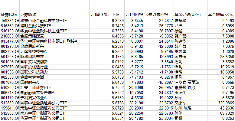Wind数据显示,本周全市场公募基金涨幅TOP20中,有9只基金是金融科技、证券主题的ETF。其中,华宝中证金融科技主题ETF、博时金融科技ETF和华夏中证金融科技主题ETF分别以6.8239%、6.7426%和6.7355%的涨幅位居前三。