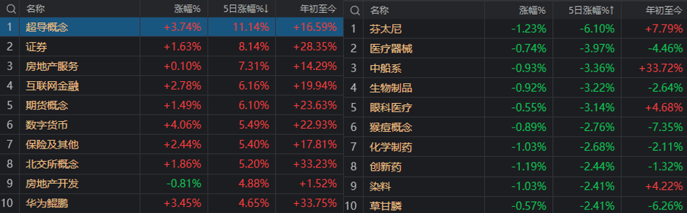 板块方面,除了特别受网友关注的超导概念一枝独秀,金融、地产还是领涨主力。领跌的则是医药板块各分支。