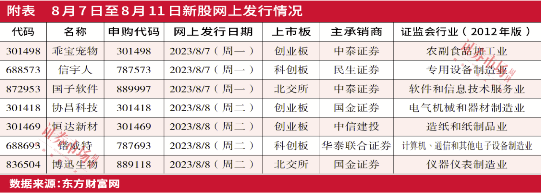 根据发行安排,下周(8月7日至8月11日)将有7只新股网上发行,包括3只创业板新股、2只科创板新股、2只北证新股。发行时间上,7只新股集中在下周一、周二发行。