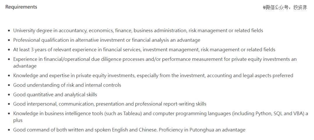在业务要求上,至少有3年金融服务、投资管理、风险管理或相关领域的相关经验,其中有私募股权投资财务/运营尽职调查流程和/或业绩衡量经验者优先;