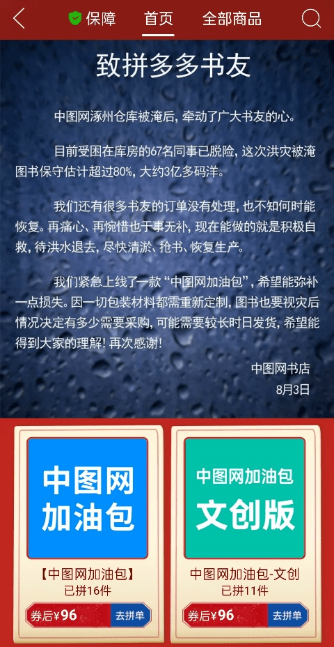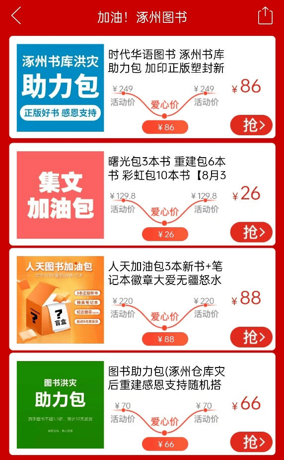 (图为专属页面内“爱心加油包”专区及中图网店铺内“加油包”商品)