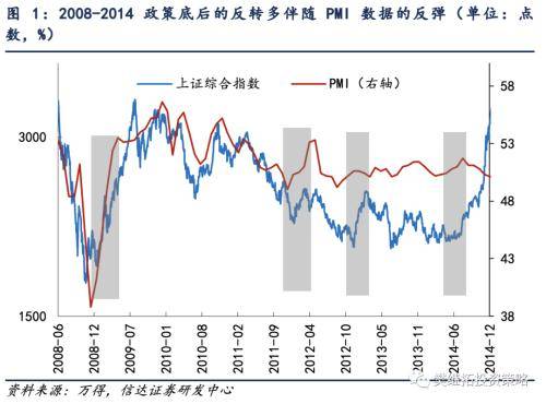 (1)政策底如果能和经济数据阶段性反弹结合,上涨大多可以持续季度以上。历史上,较大级别的政策底后,市场反弹或反转的过程中,一旦出现“部分”宏观数据的反弹,则上涨的时间大多能持续季度以上。2008年底、2012年底、2014年中,指数进入较大级别反转期间,均出现了阶段性的PMI回升,即使是2014年下半年的流动性牛市,在上涨的初期(2014年6-7月),也能观察到明显的PMI回升。2010年下半年和2012年Q1长时间的反弹,也伴随着PMI的回升。我们认为这些回升有些是趋势性的(比如2008年),但即使不是趋势性的,一旦阶段性反弹和政策底形成共振,也可以带来季度级别的行情。