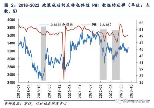 类似的情形在2018年底、2022年4月底、2022年10月底之后的季度反弹中也出现了。背后有两种可能的解释:(1)PMI反弹期间,盈利的利空暂时缓和,政策预期对市场的影响会更大。(2)政策变化对企业的信心会产生直接的影响,这一影响不一定能改变长期趋势,但很容易带来季度性的经济数据回升。