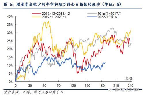 这几次上涨都发生在熊市刚结束后第一年(或者可以说是牛市初期),是因存量资金仓位腾挪带来的上涨,最大涨幅大多数情况下能达到20%-30%左右。把去年10月底以来万得全A的走势和这几个阶段对比,能够看到这一次底部以来,目前涨幅只有11.72%,存量资金往上可以腾挪的空间还很高。