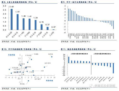 上周A股主要指数均上涨,创业板50(2.63%)涨幅最大,上证50(0.07%)涨幅最小,申万一级行业本周涨跌不一,其中计算机(4.09%)、非银金融(4.07%)、传媒(3.51%)、通信(3.34%)领涨,医药生物(-2.75%)、煤炭(-1.75%)、纺织服装(-1.29%)领跌。概念股中,远程办公(15.74%)、互联网金融(6.16%)、期货概念(6.10%)领涨,固态电池(-25.21%)领跌。