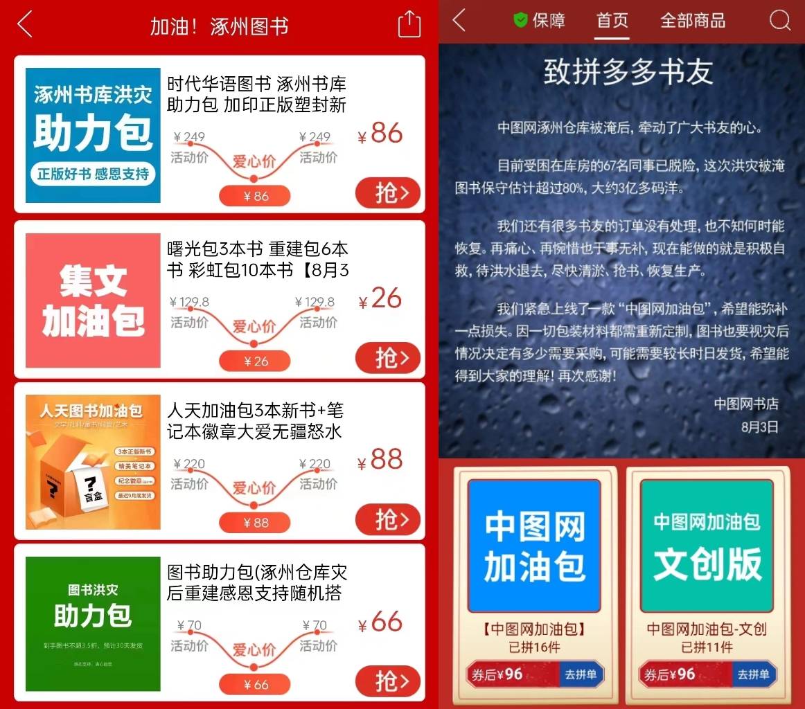 为帮助涿州受灾的图书商家减少损失,渡过难关,尽快恢复正常经营,8月5日,拼多多推出专场活动,在拼多多App搜索栏输入“加油涿州图书”或“+++”,即可进入专场页面。此次专场活动上线了中图网、时代华语、六彩云端等多家店铺的“加油包”,“加油包”由数本非泡水图书组成一个盲盒。