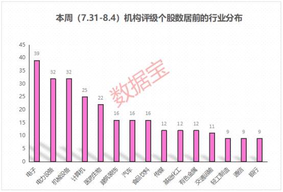 从申万一级行业来看,电子行业有39股获机构评级,位居首位;电力设备、机械设备行业均有32股获机构评级;计算机行业有25股获机构评级,居前。