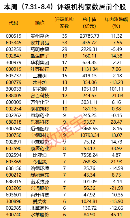 本周(7月31日至8月4日),62家机构合计进行806次评级,350家上市公司获“买入型”评级(包括买入、增持、强烈推荐、推荐)。