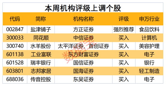 本周机构合计上调7股评级,方正证券上调盐津铺子评级至“强烈推荐”,同花顺、工业富联等均获机构上调评级至“买入”。